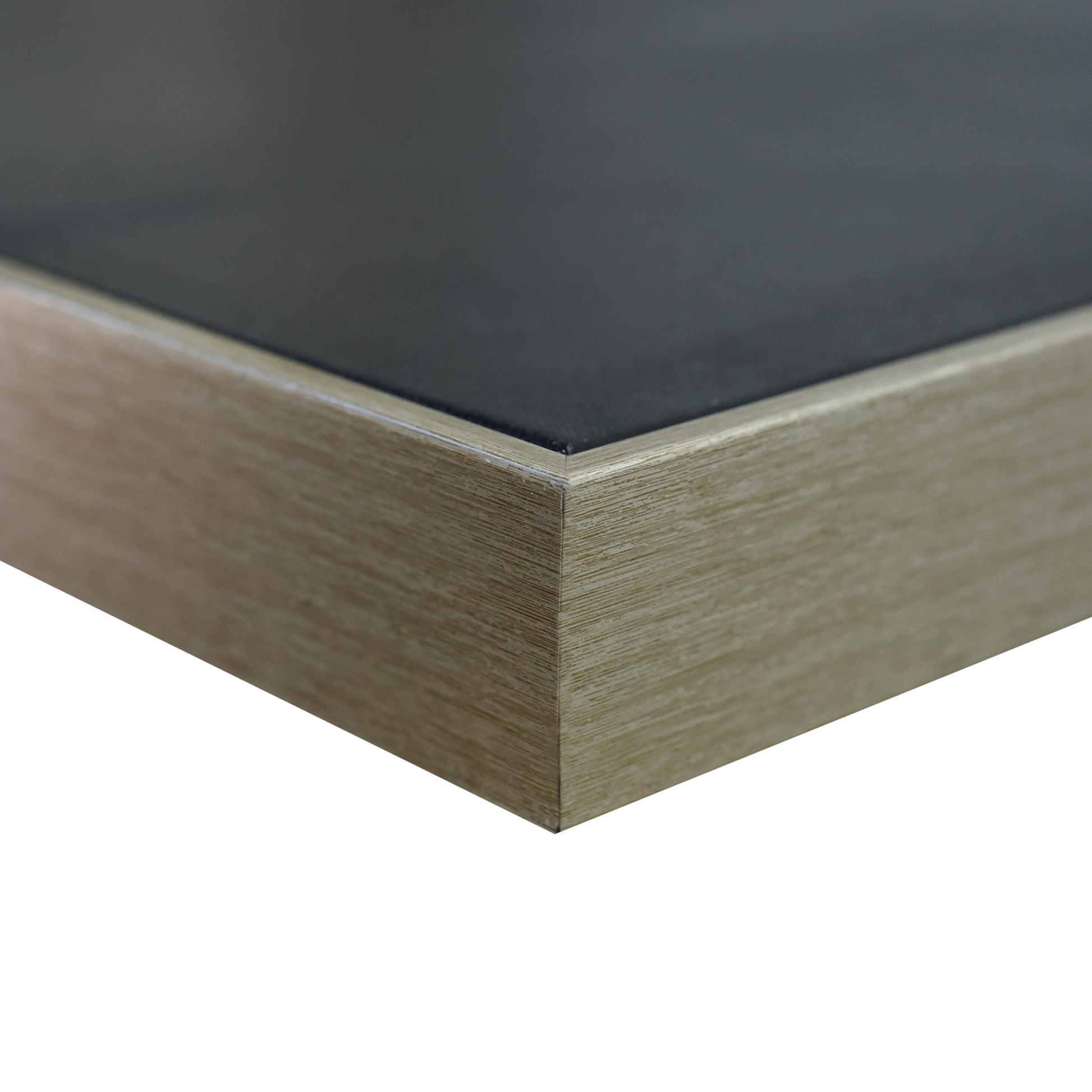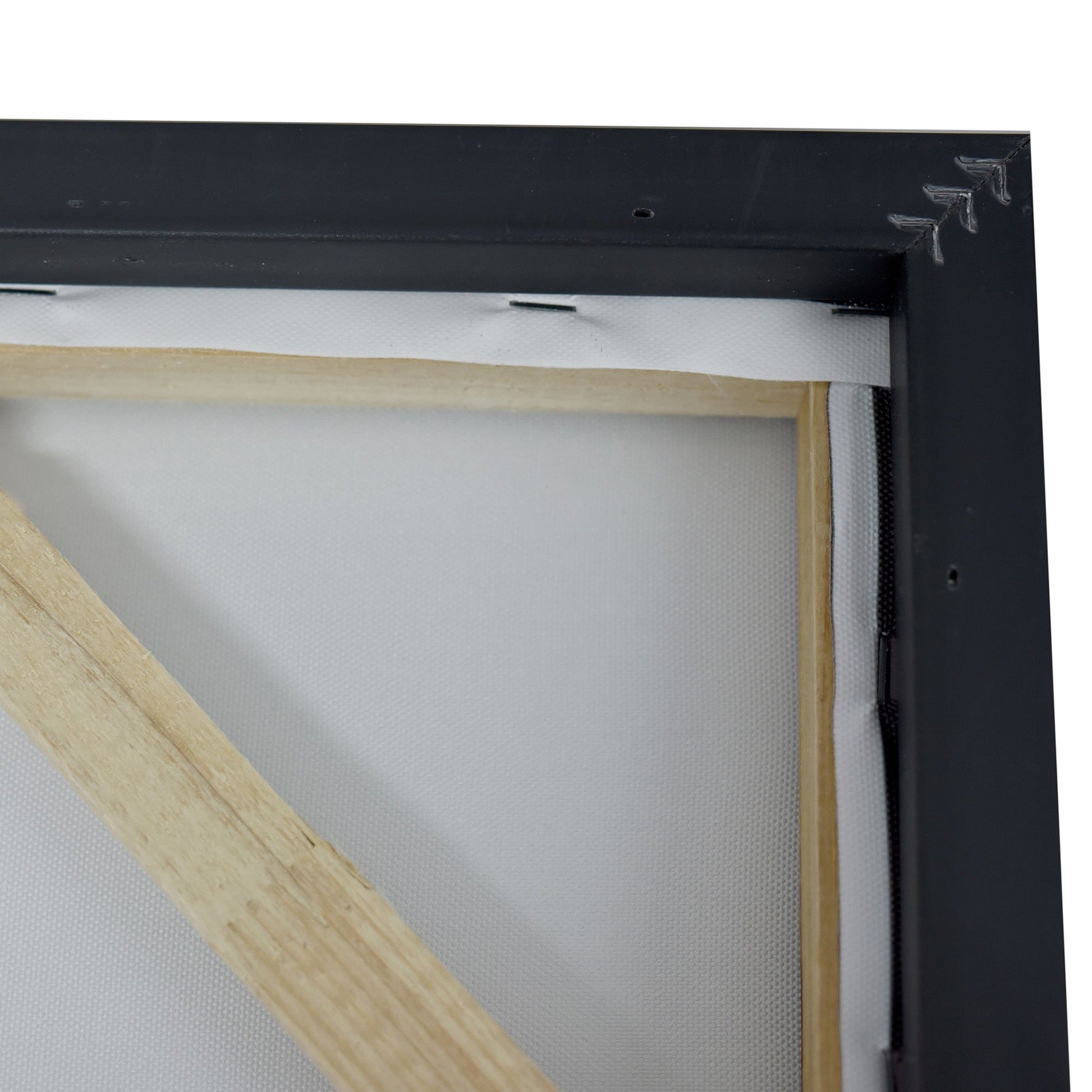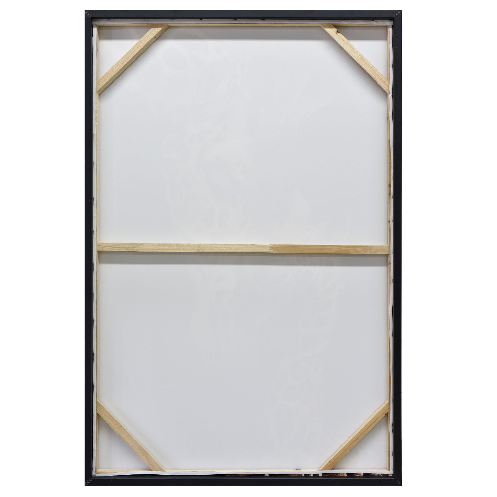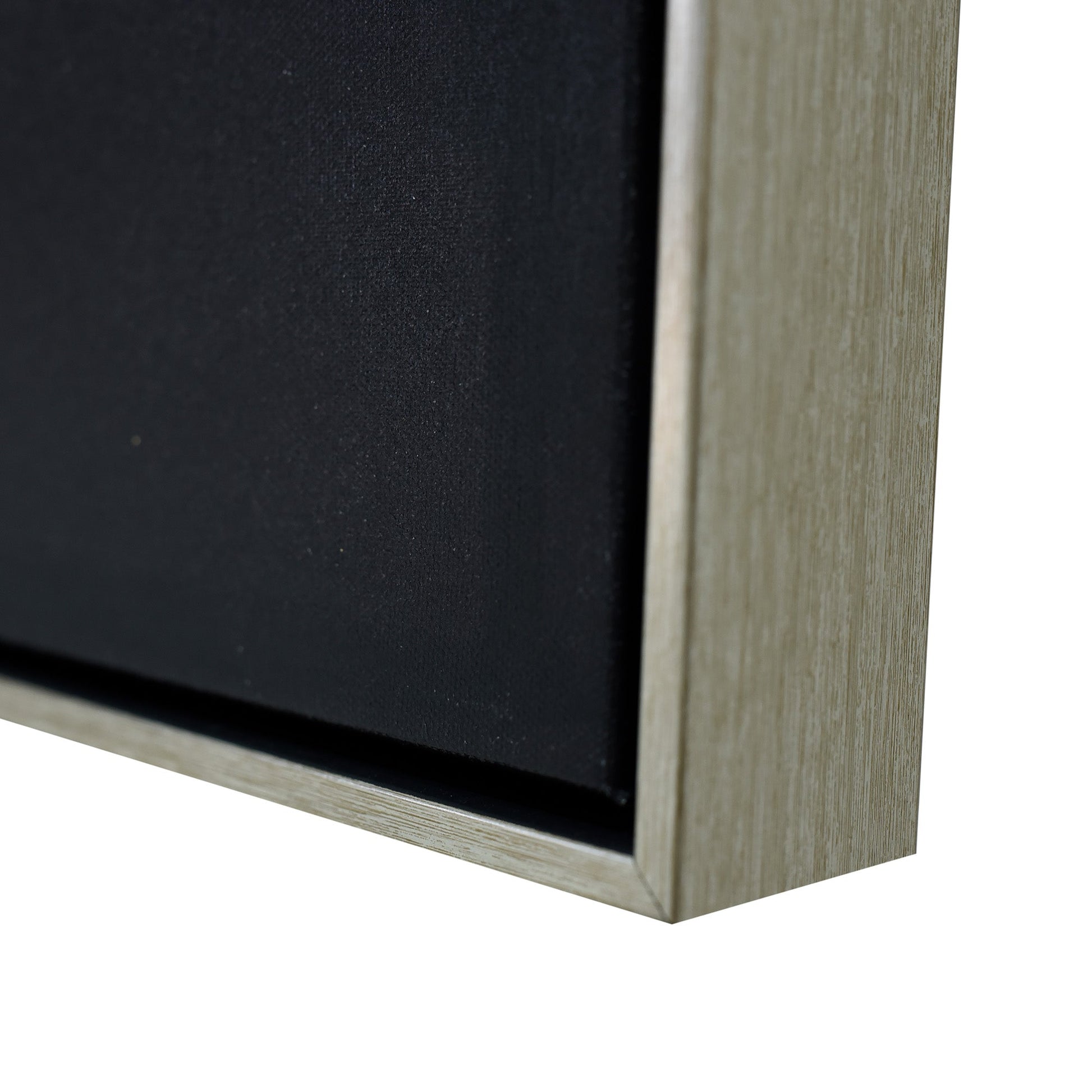 Stretched and gallery wrapped around a wooden stretcher and finished with a floating frame. There is a gap between the frame and print, which creates the floating effect and literally makes the canvas print stand out even more.