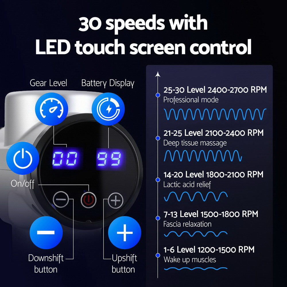 Whether you're a hard-core gym junkie, a dedicated office worker or recovering from an injury, you'll find relief with an Everfit Massage Gun. With a powerful high-torque brushless motor, the massage gun allows for high-frequency vibration at 1200-2700 strokes per minute and penetrates deeply for muscle relaxation from the comfort of home. The massage gun uses long-lasting and efficient rechargeable lithium batteries that allow the gun to run for up to 2 hours. There are 30 speed levels to suit various purposes; from simply waking up your muscles to relieving lactic acid and assisting muscle recovery after exercising, or even intense professional-level massages. The non-slip rubber handle provides a comfortable grip to reduce hand fatigue, and the device operates quietly for a comfortable massage experience. The smart touch LED display makes it easy to customize your massage experience. With six unique head attachments, the Everfit Massage Gun can help you dissipate fatigue, relax your muscles and relieve neck and back pain. Gets yours today and continue your fitness journey in comfort.