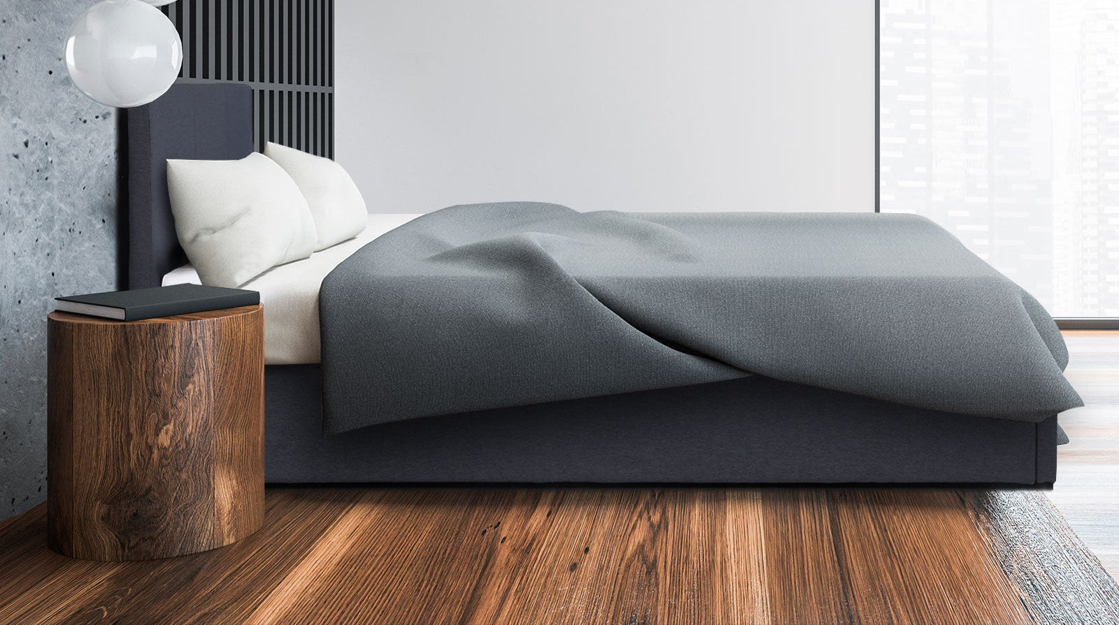 This bed frame and the complementary headboard is encased in a high-quality fabric upholstery with clean and smooth edges that complement the modern design and adds another layer of comfort to the bedroom experience.