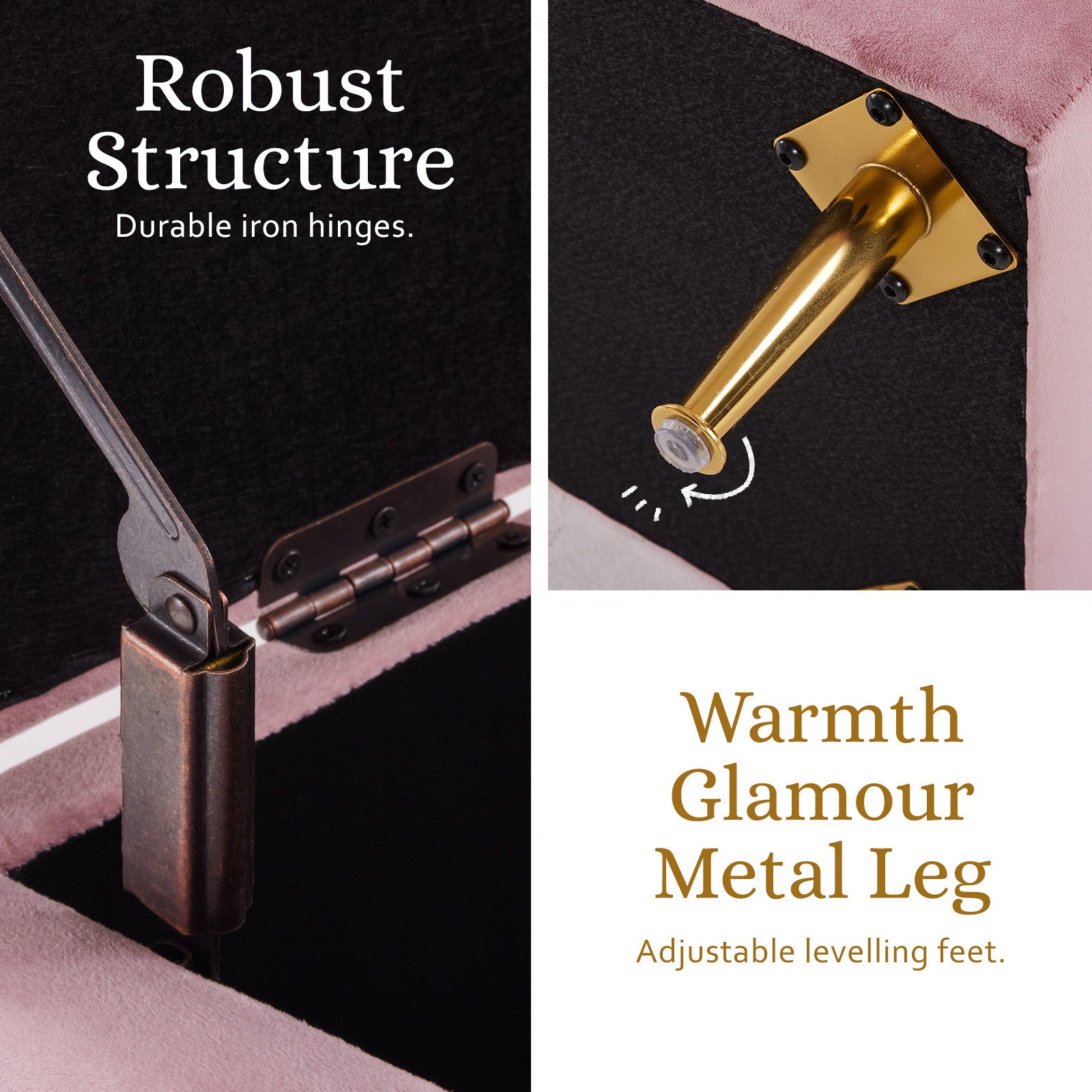 With sleek metal legs for stability, lift the lid to find a roomy interior - ideal for storing blankets and pillows discreetly. This Ottoman Storage is more than practical; it's versatile, serving as a comfy footrest or extra seating for guests.